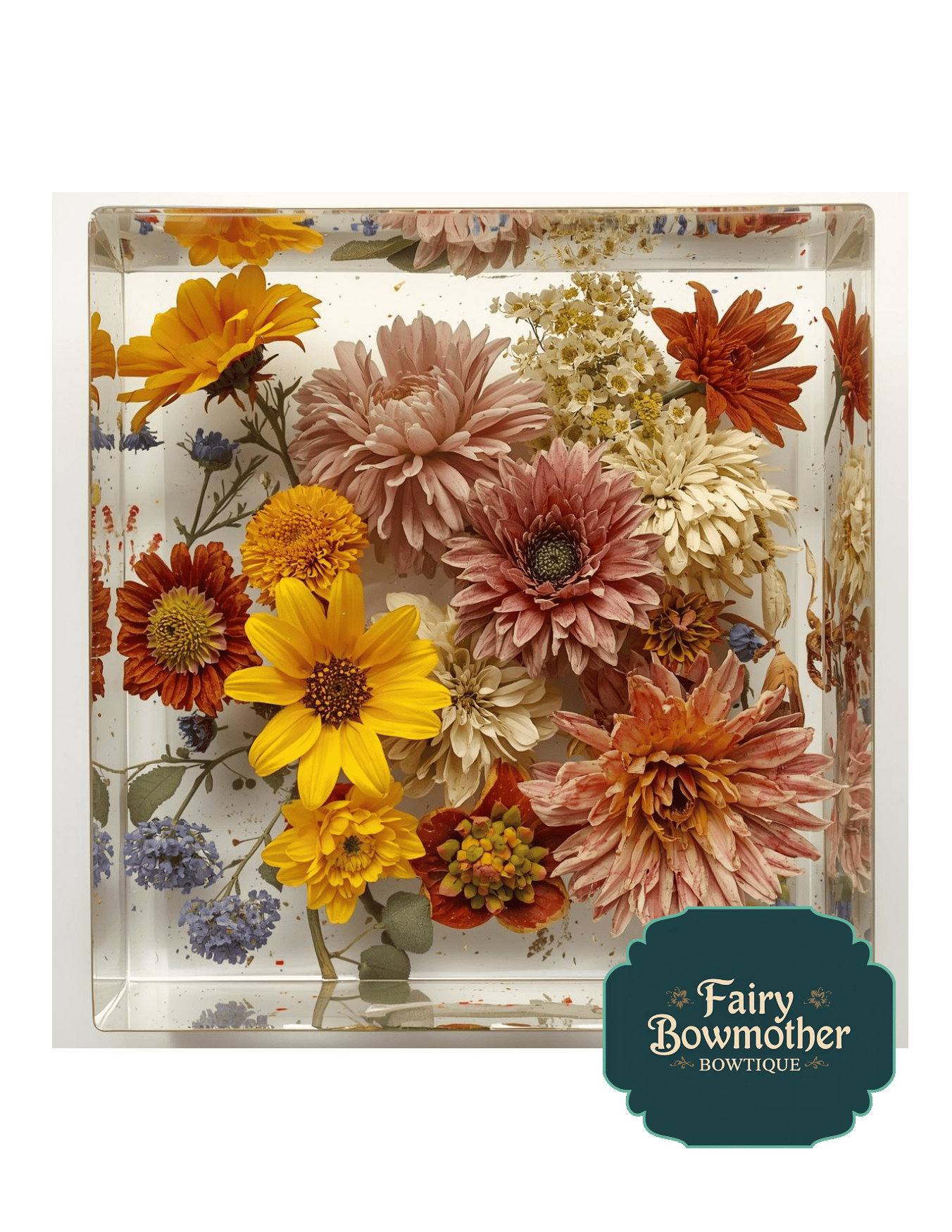 A one-of-a-kind, handcrafted resin piece made with your real flowers. Options include: